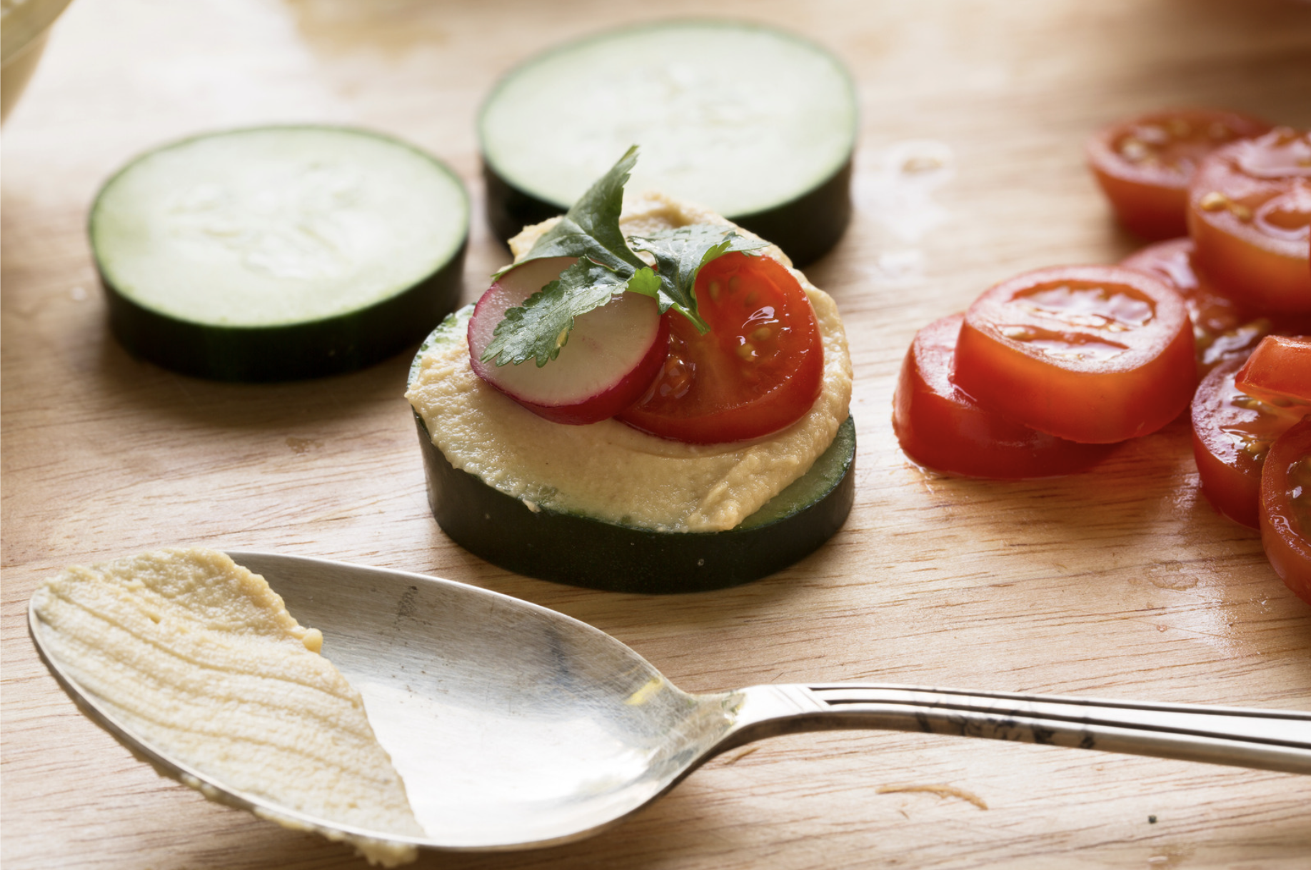 2) Spread 1 teaspoon of hummus on top of each cucumber slice.